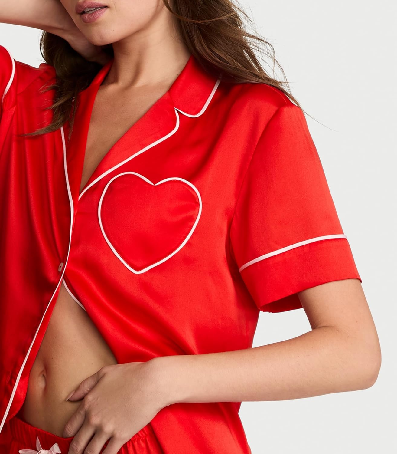 Discover the epitome of comfort and style with our luxurious women’s pajama set, designed to ensure you get your beauty sleep in chic elegance. This glossy set, featuring a short-sleeve button-up top and matching shorts, is crafted for the modern woman who values both relaxation and fashion. Made by the iconic Victoria’s Secret, this pajama set is not just about sleeping—it’s about experiencing the night in style.